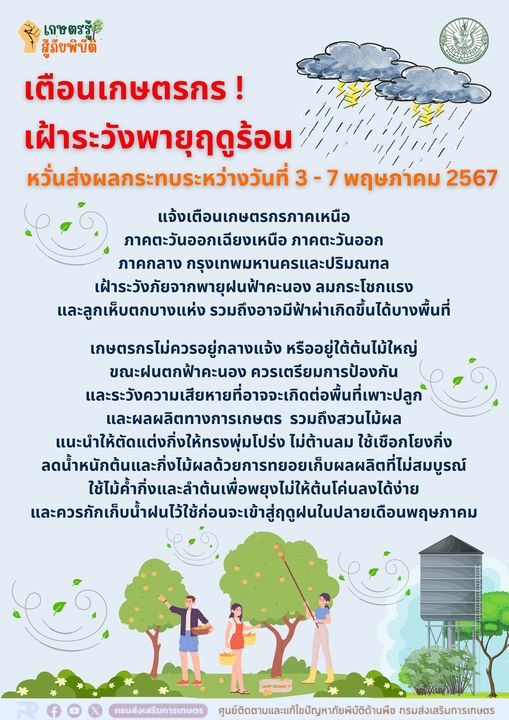 — ข่าวกิจกรรมทั่วไป ข่าวสาร เตือนเกษตรกร ! เฝ้าระวังพายุฤดูร้อน มีผลกระทบระหว่างวันที่ 3 – 7 พฤษภาคม 2567 พฤษภาคม 2, 2024 webmaster Continue Reading Previous ข่าวประจำเดือน พฤษภาคม 2567 Next เรียนฟรี ผู้สนใจ “ต่อยอดรายได้เกษตรกรด้วยคาร์บอนเครดิต” More Stories — ข่าวสารการเกษตร ข่าวสาร ข่าวประจำเดือน ตุลาคม 2568 กันยายน 29, 2025 webmaster — ข่าวสารการเกษตร ข่าวสาร ข่าวประจำเดือน กันยายน 2568 กันยายน 1, 2025 webmaster — ข่าวส่งเสริมการเกษตร — ข่าวสารการเกษตร ข่าวสาร ข่าวประจำเดือน สิงหาคม 2568 สิงหาคม 1, 2025 webmaster